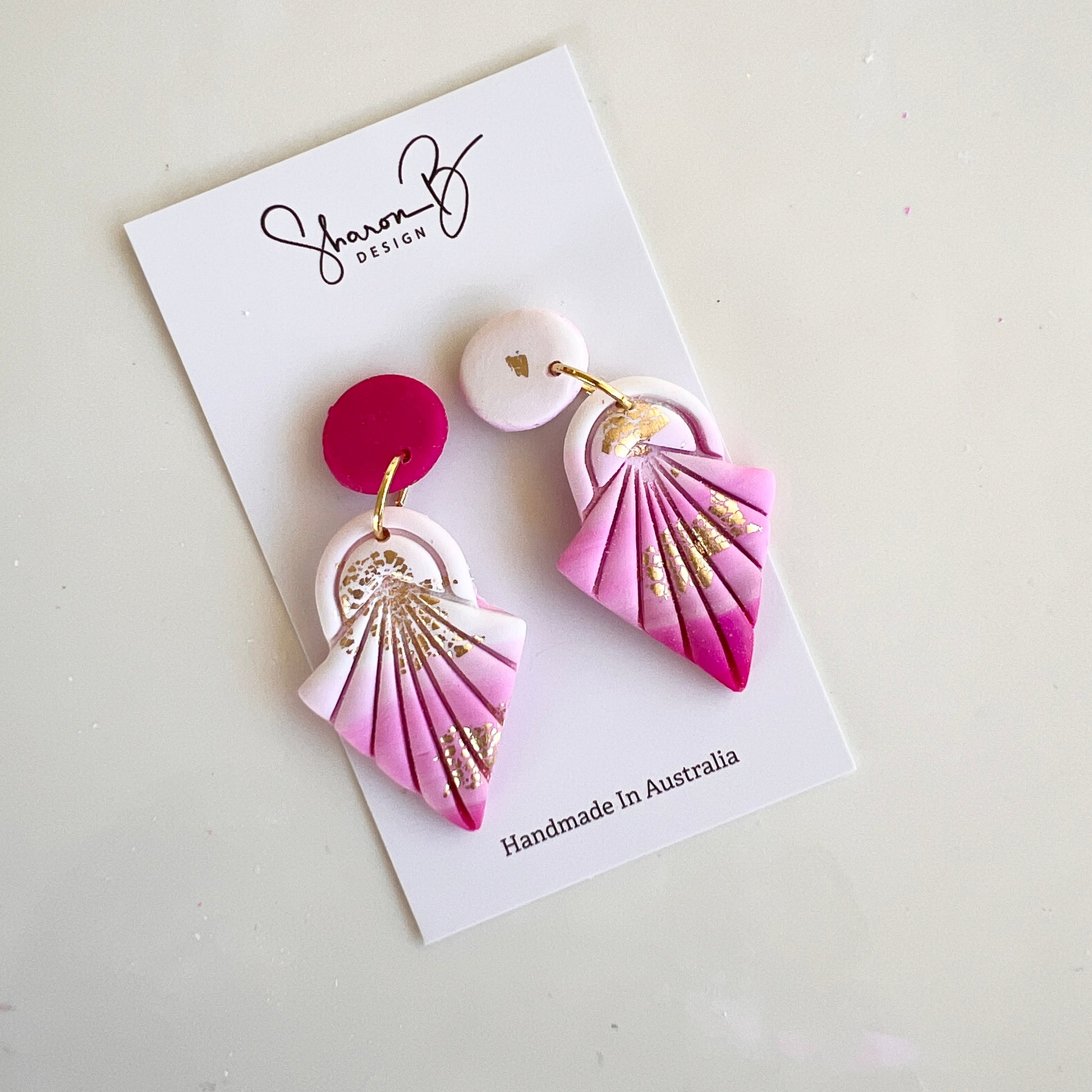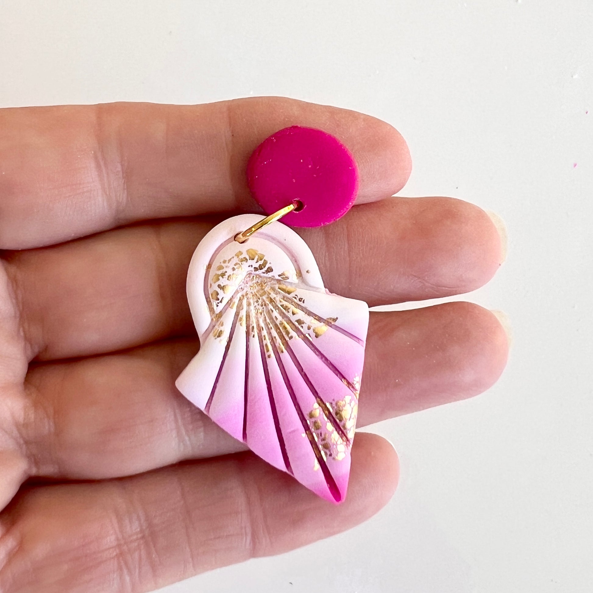 Corrina ~ Polymer Clay Dangle Earrings. Art Deco inspired dangles. Fuschia and White with a touch of Gold Leaf.