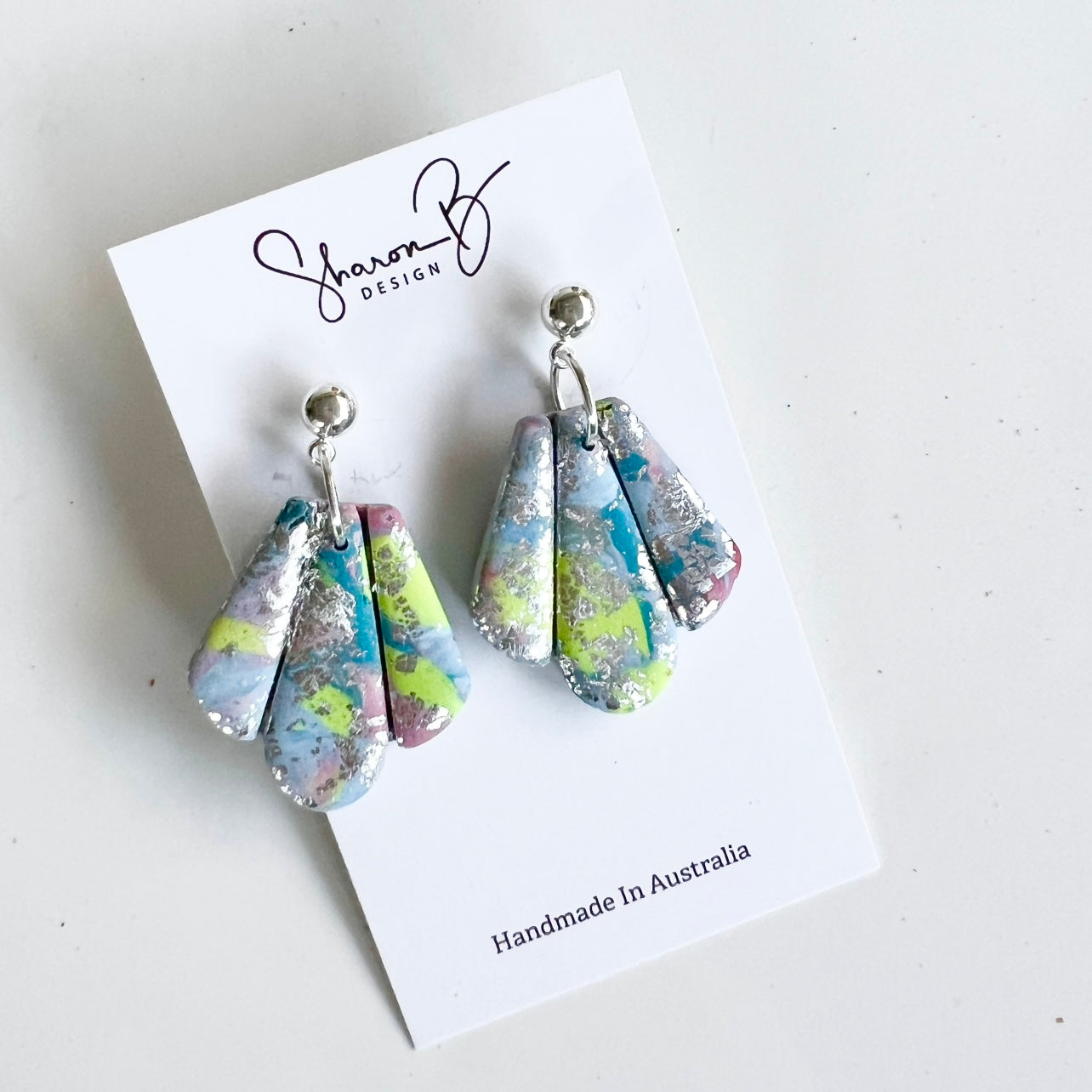 Suzanne~Pretty Blu and Green dangle finished with a sprinkling of Silver Leaf.